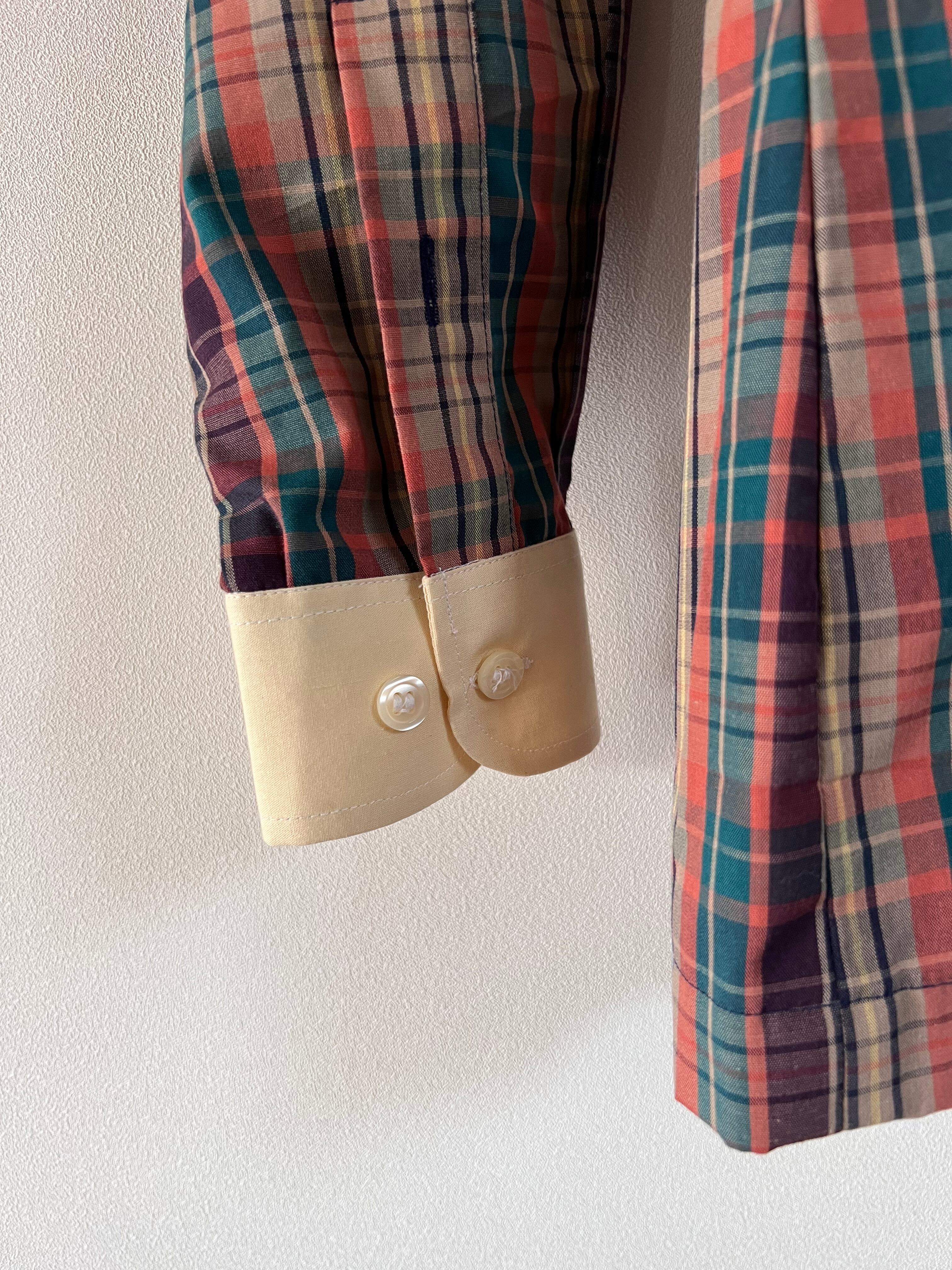落ち着いたカラーのチェック柄に、襟と袖の淡いイエローがアクセントになるシックなシャツ。