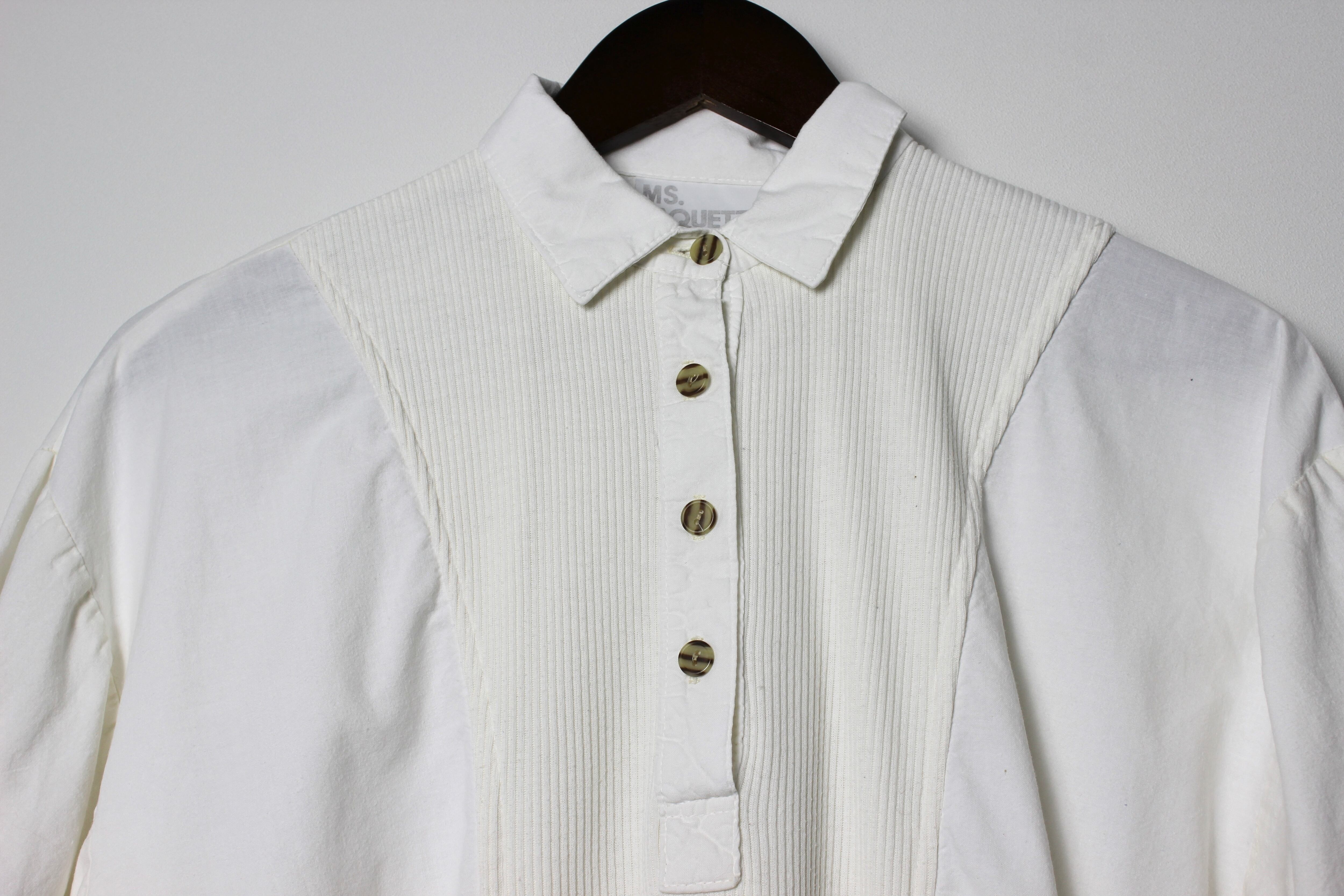 一見シンプルながら、襟やボタン、二重になったポケット、裾のリブなど細かいディテールに遊び心あふれるトップス。