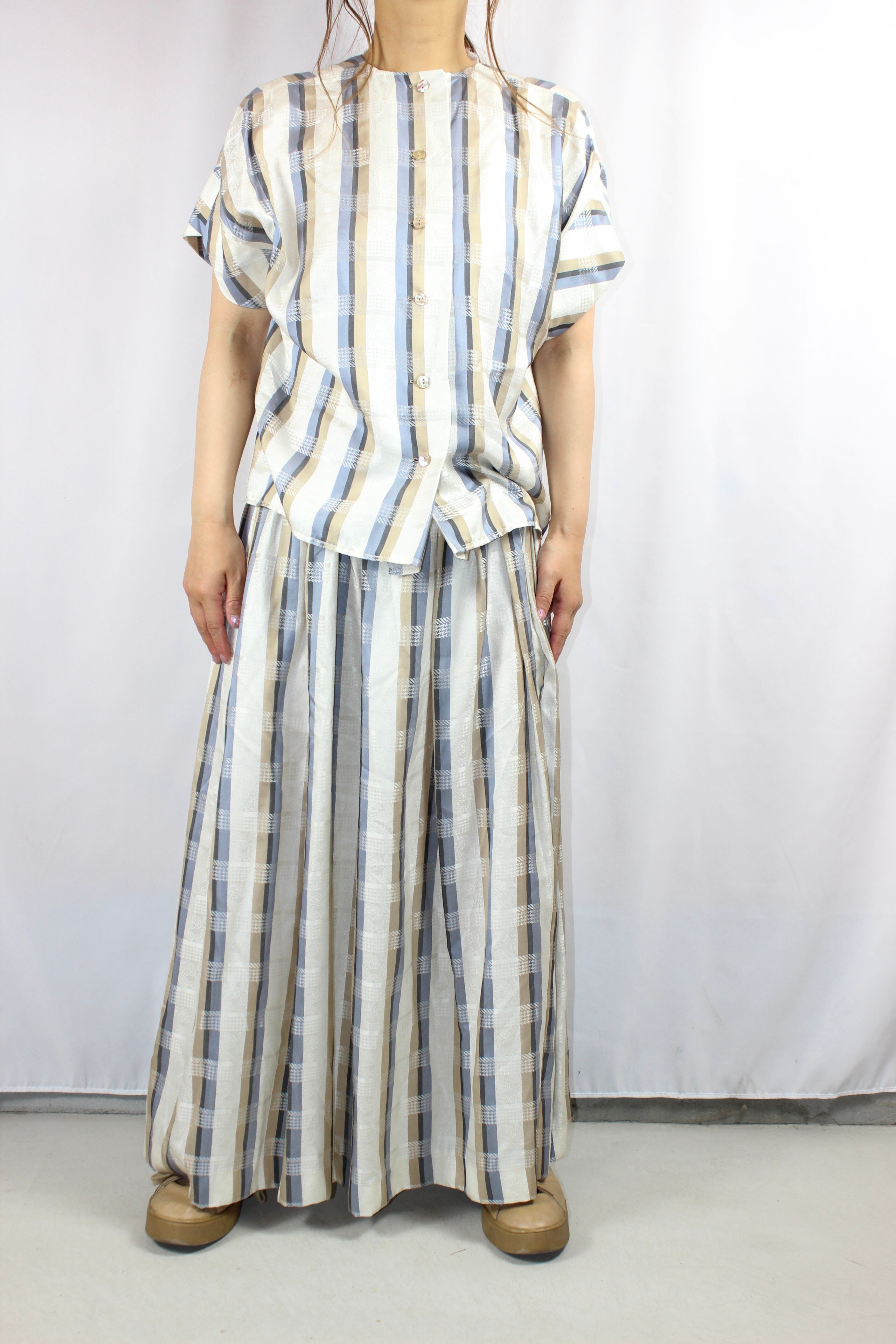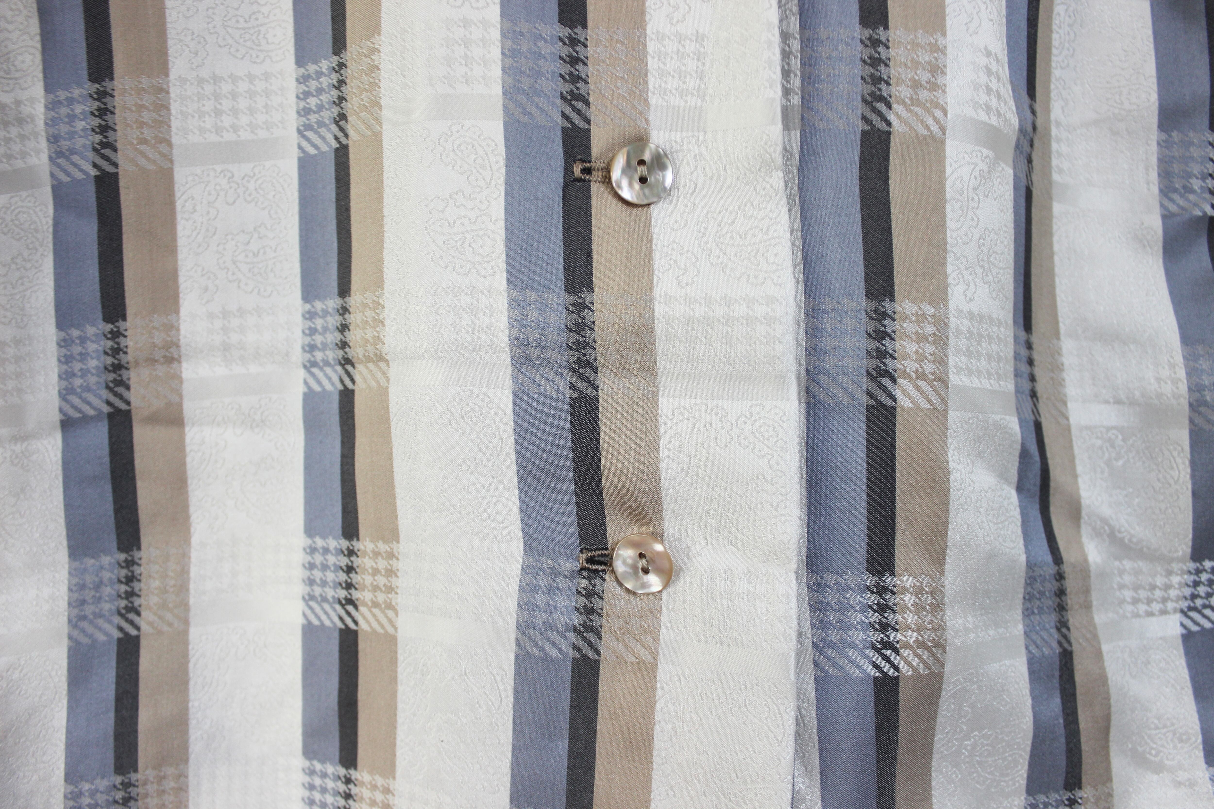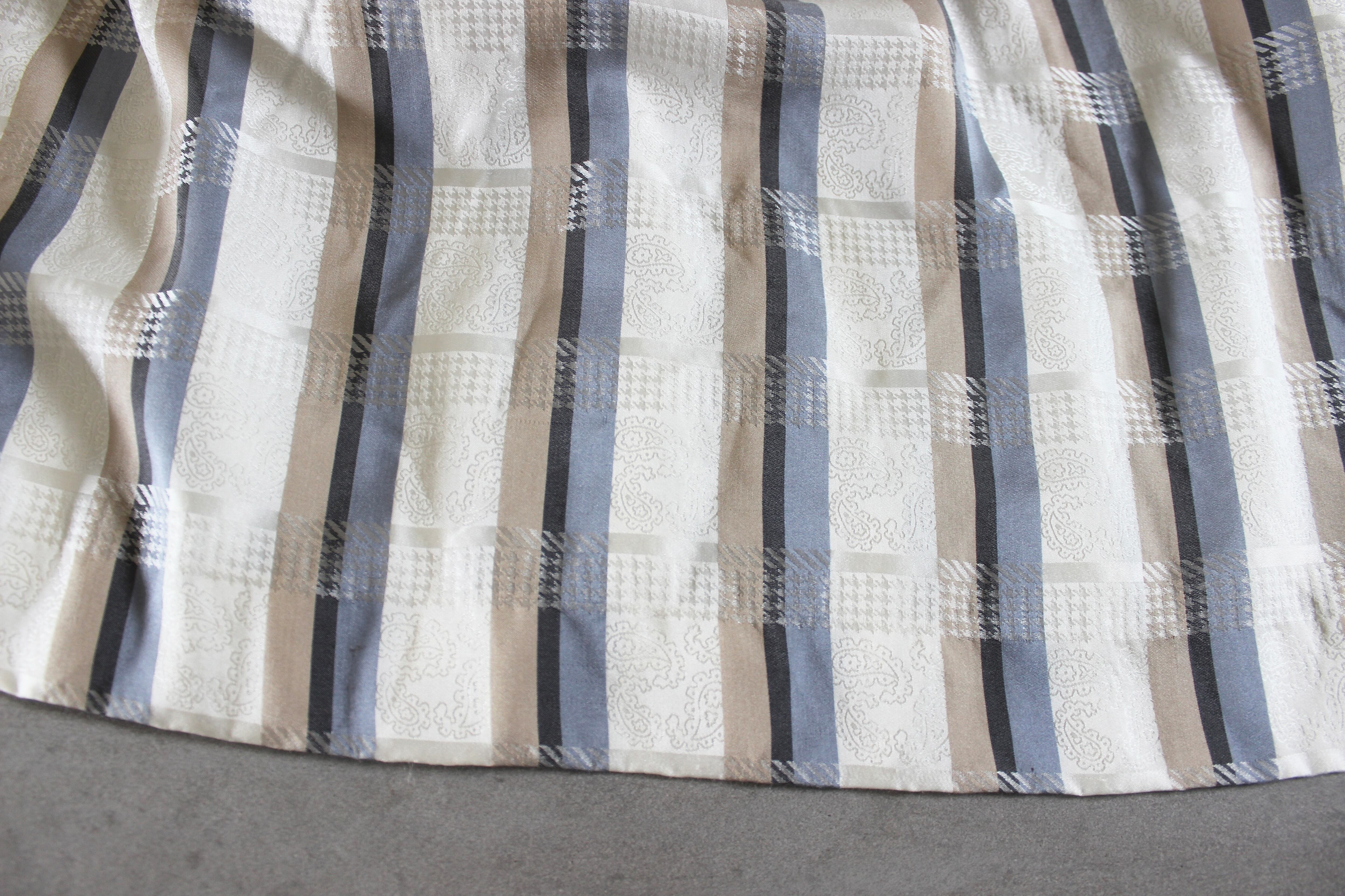 白地に、ブルー・グレー・ベージュのストライプと、白い幾何学模様が交差してチェック柄のように見える特徴的なテキスタイルで、よく見ると白地部分には淡いペイズリー柄もプリントされています。