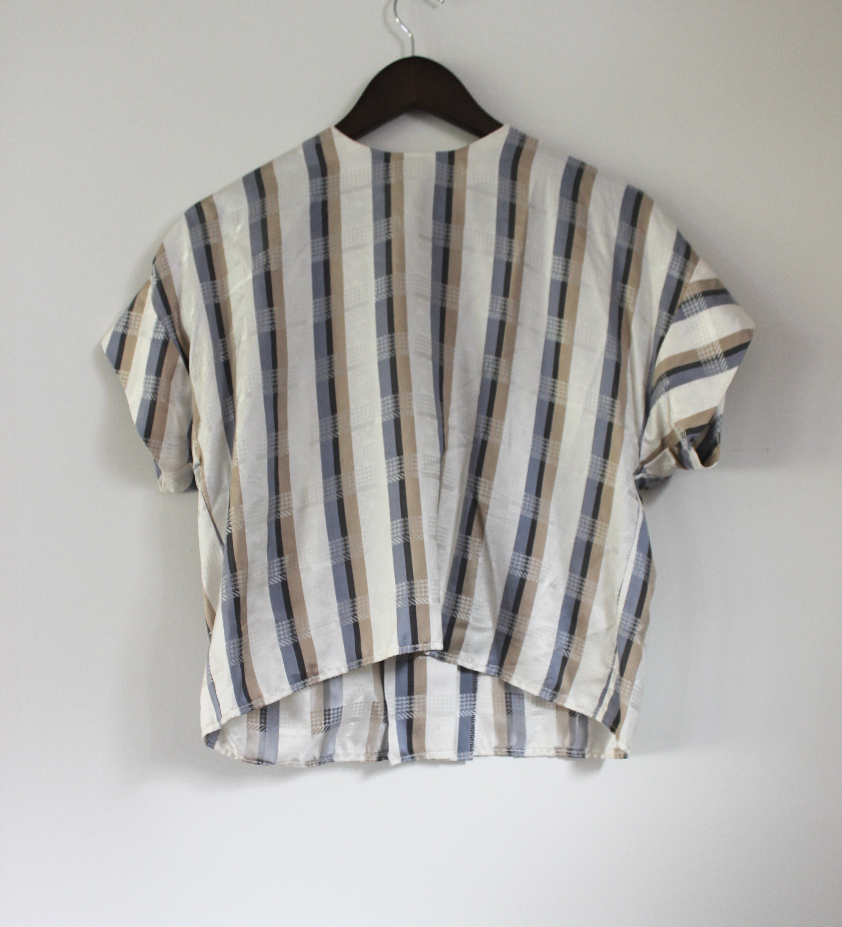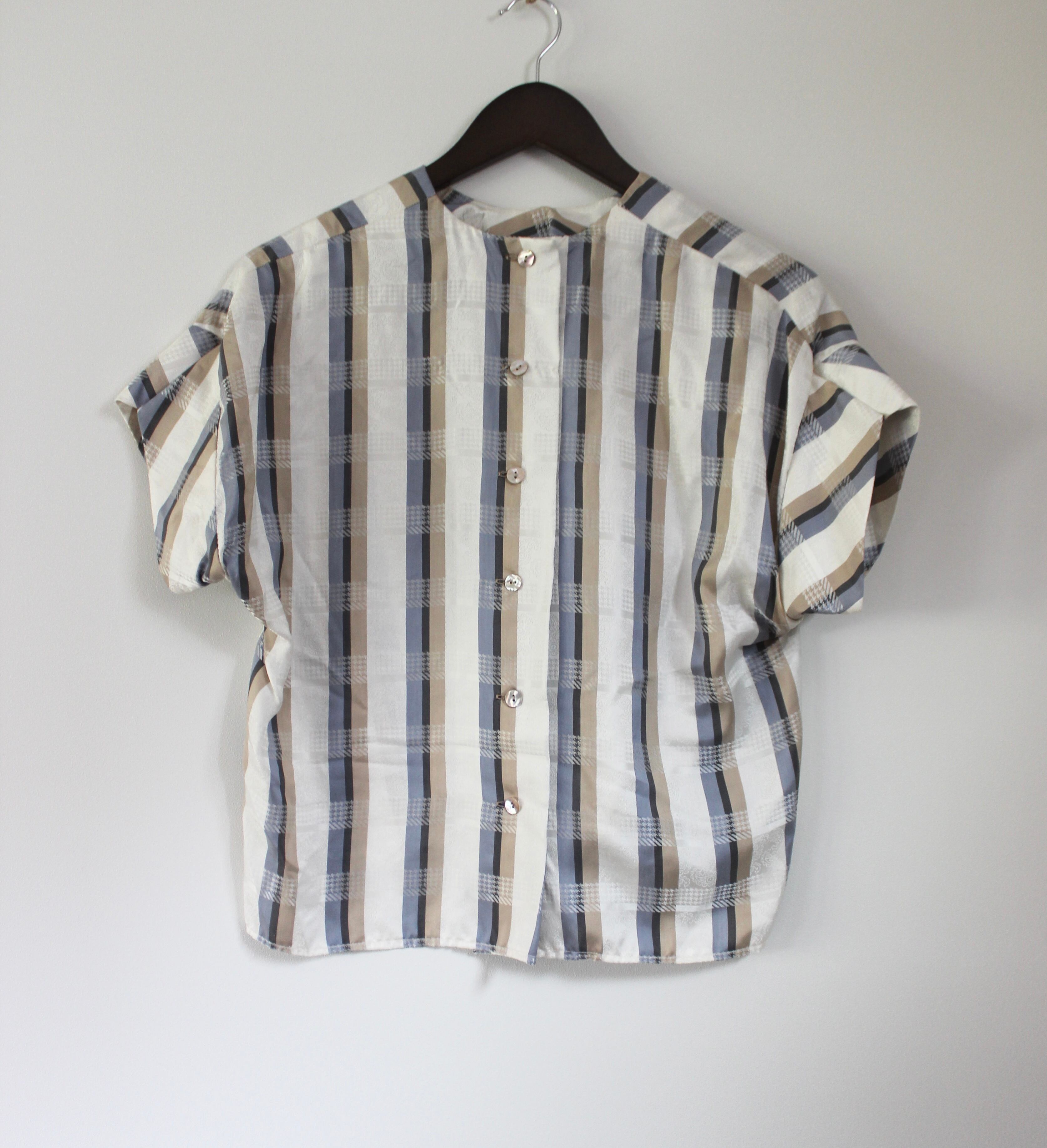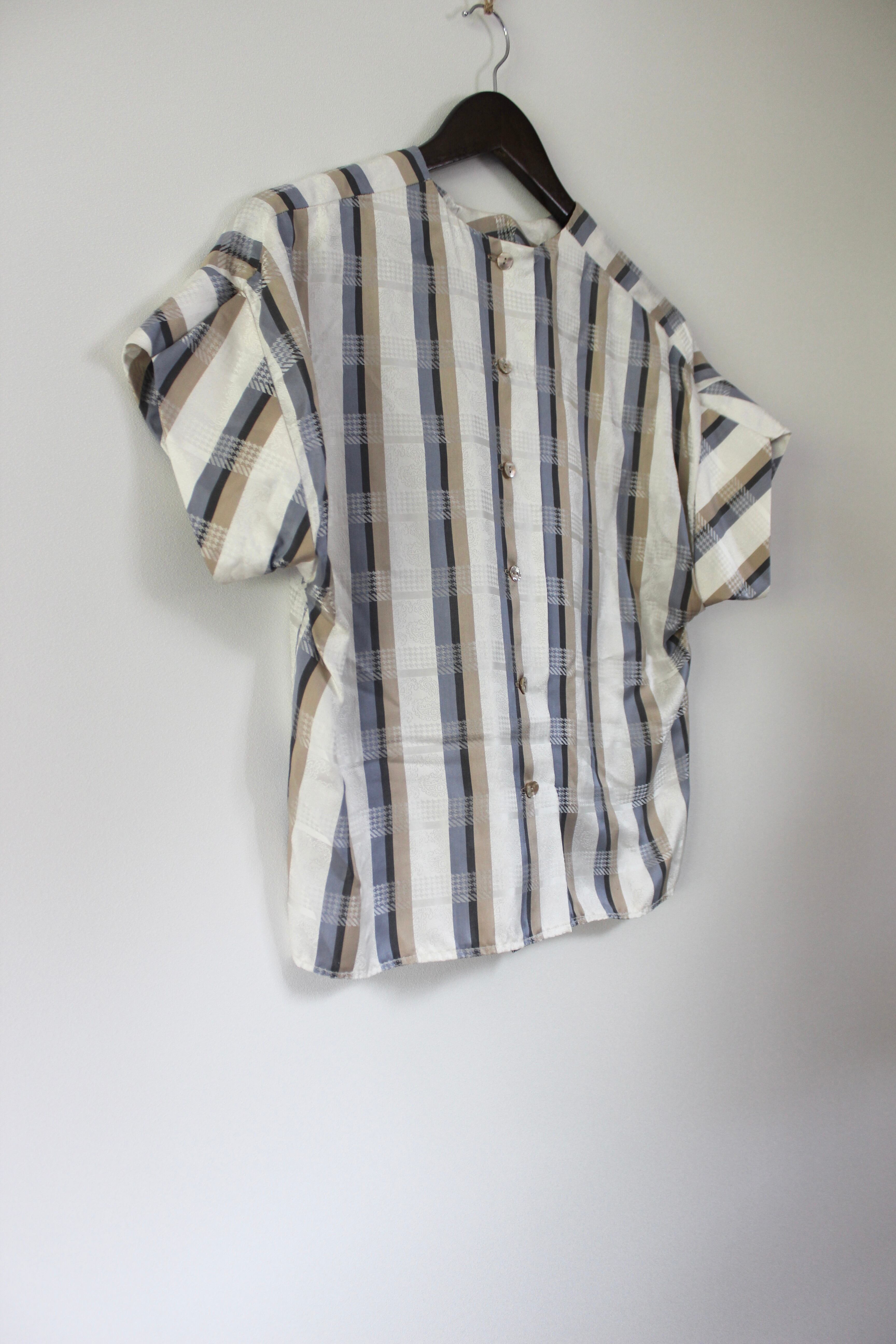 白地に、ブルー・グレー・ベージュのストライプと、白い幾何学模様が交差してチェック柄のように見える特徴的なテキスタイルで、よく見ると白地部分には淡いペイズリー柄もプリントされています。