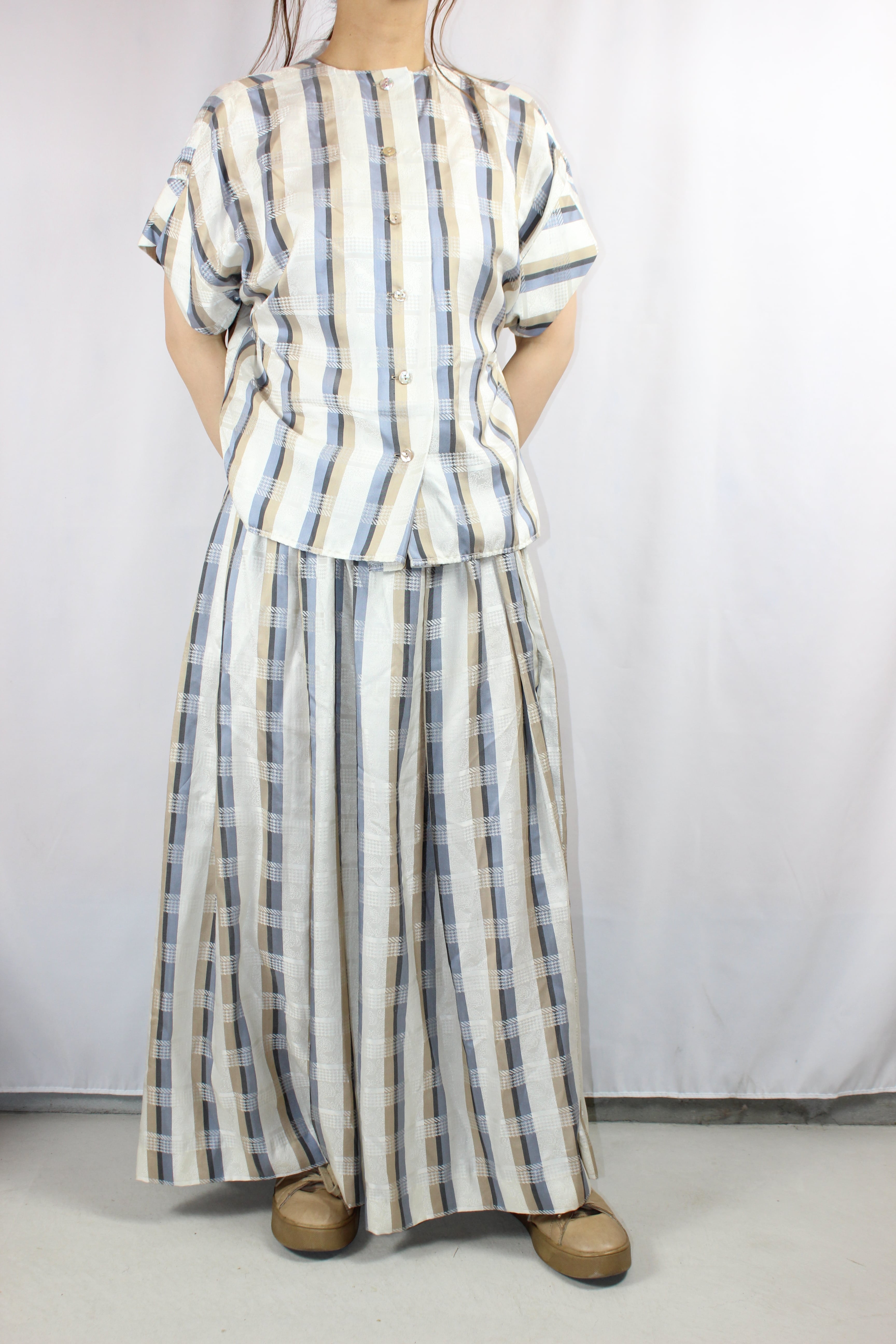 初夏にぴったりな、半袖シャツとロングスカートのセットアップ。