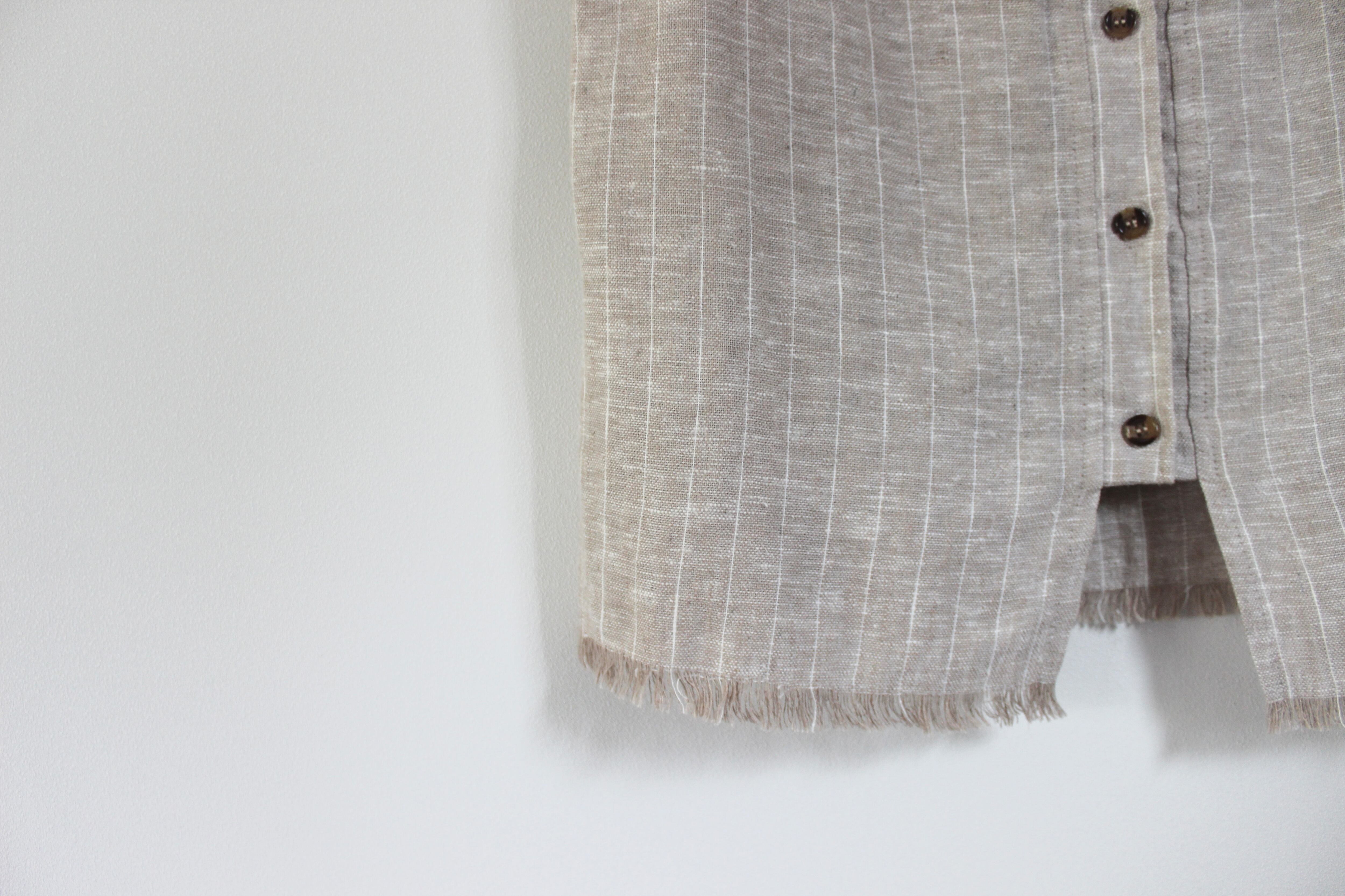 前面はシンプルにまとまり、裾のフリンジがさりげないアクセントに。背面はボタンダウンになっておりまた違った表情になります。