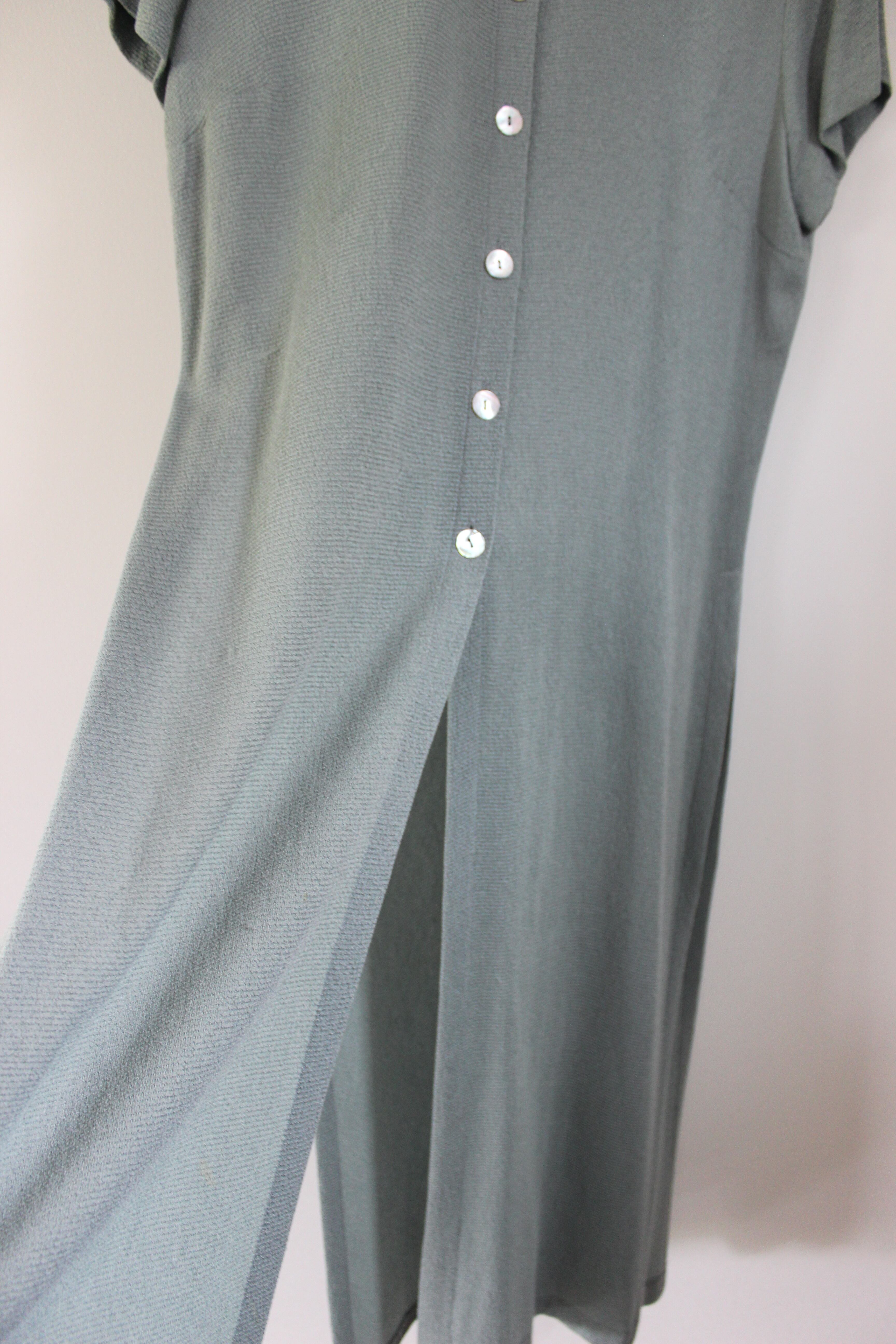くすんだ水色のさらりとしたレーヨン生地で作られた、ワンピースとパンツのセットアップ。