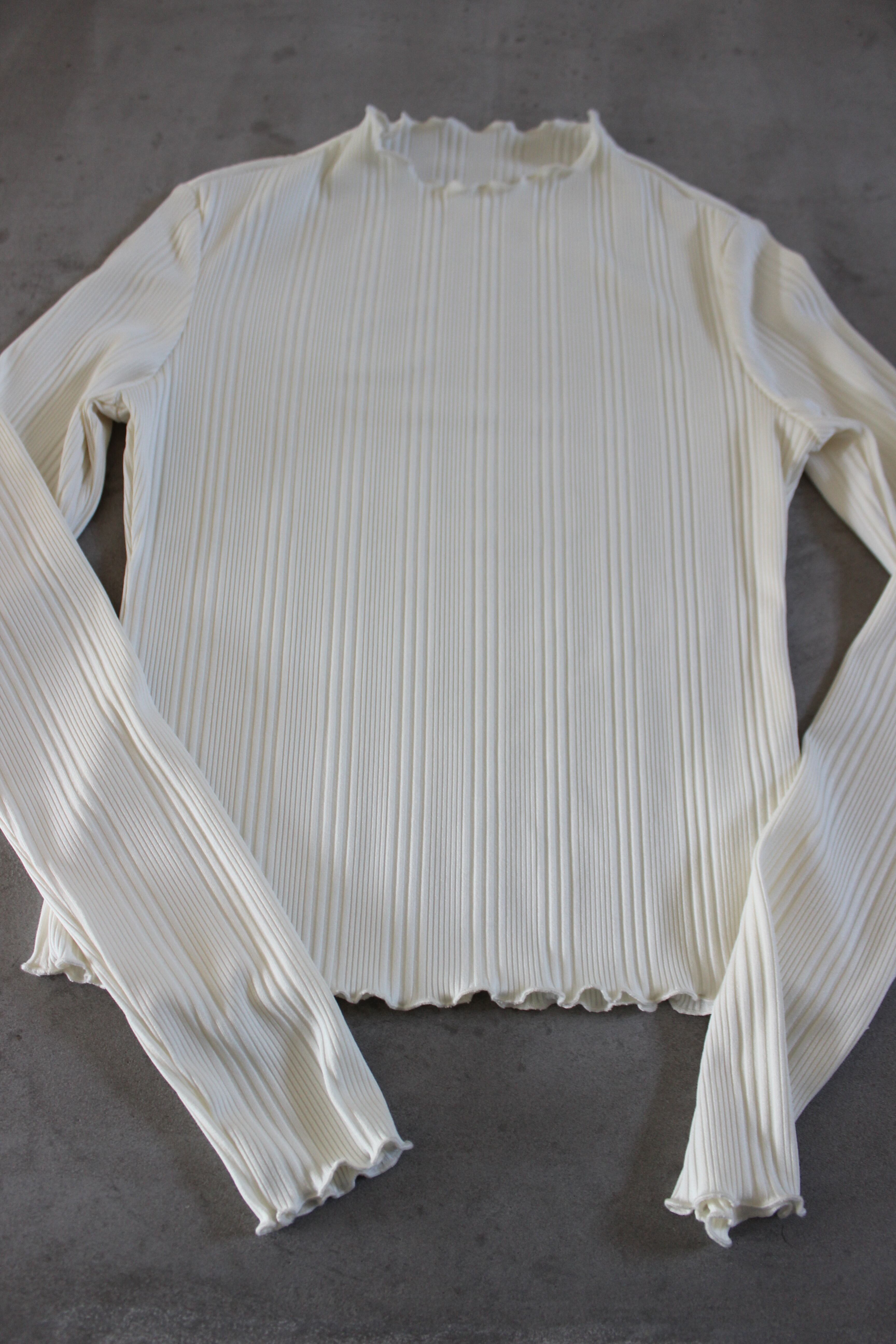 状態の良い白いリブ素材のトップス。襟元と袖のさりげないフリルがかわいらしいデザイン。