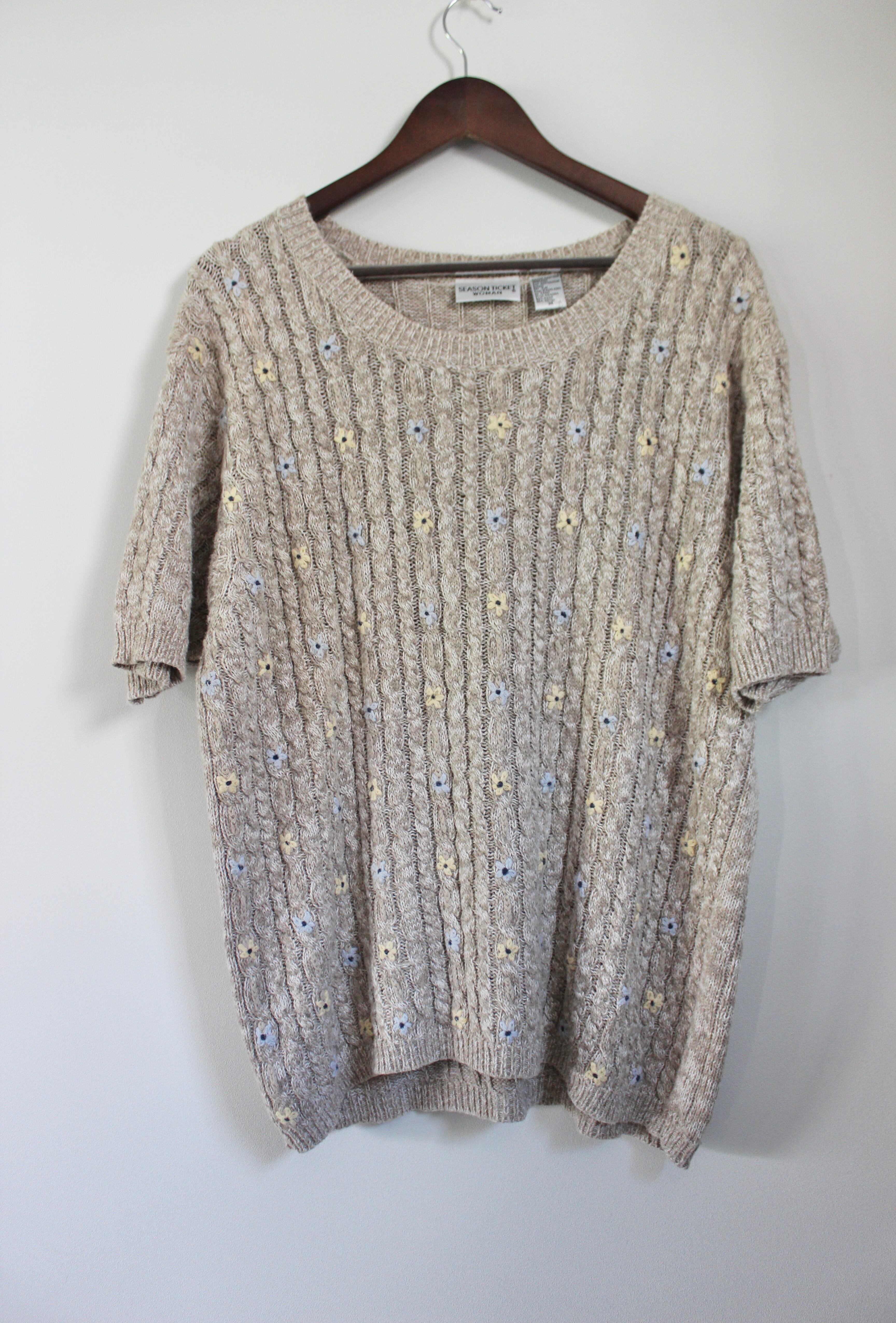 ベージュのケーブルニットの前面に、水色と黄色のお花が編み込まれたデザインが特徴的なニット。
