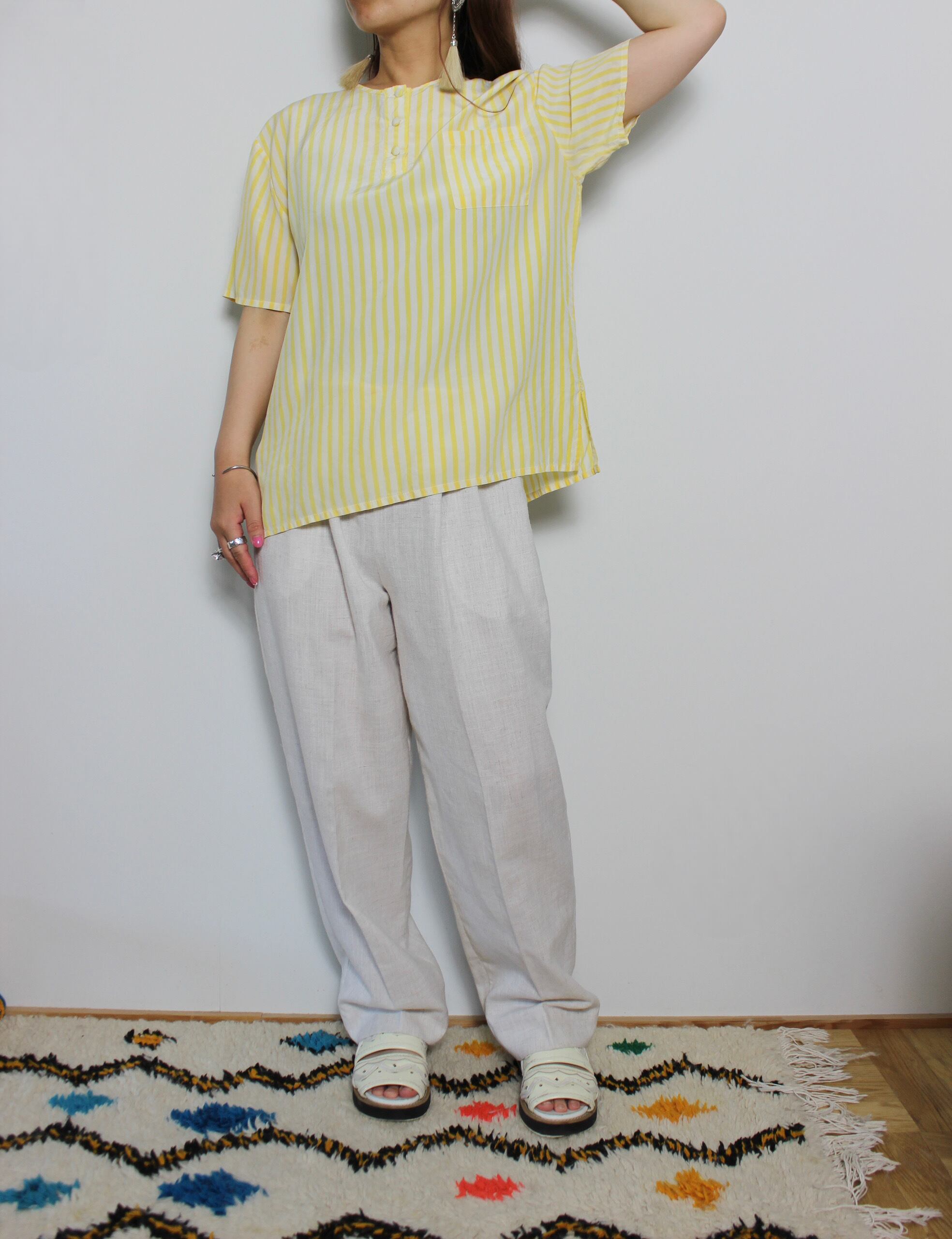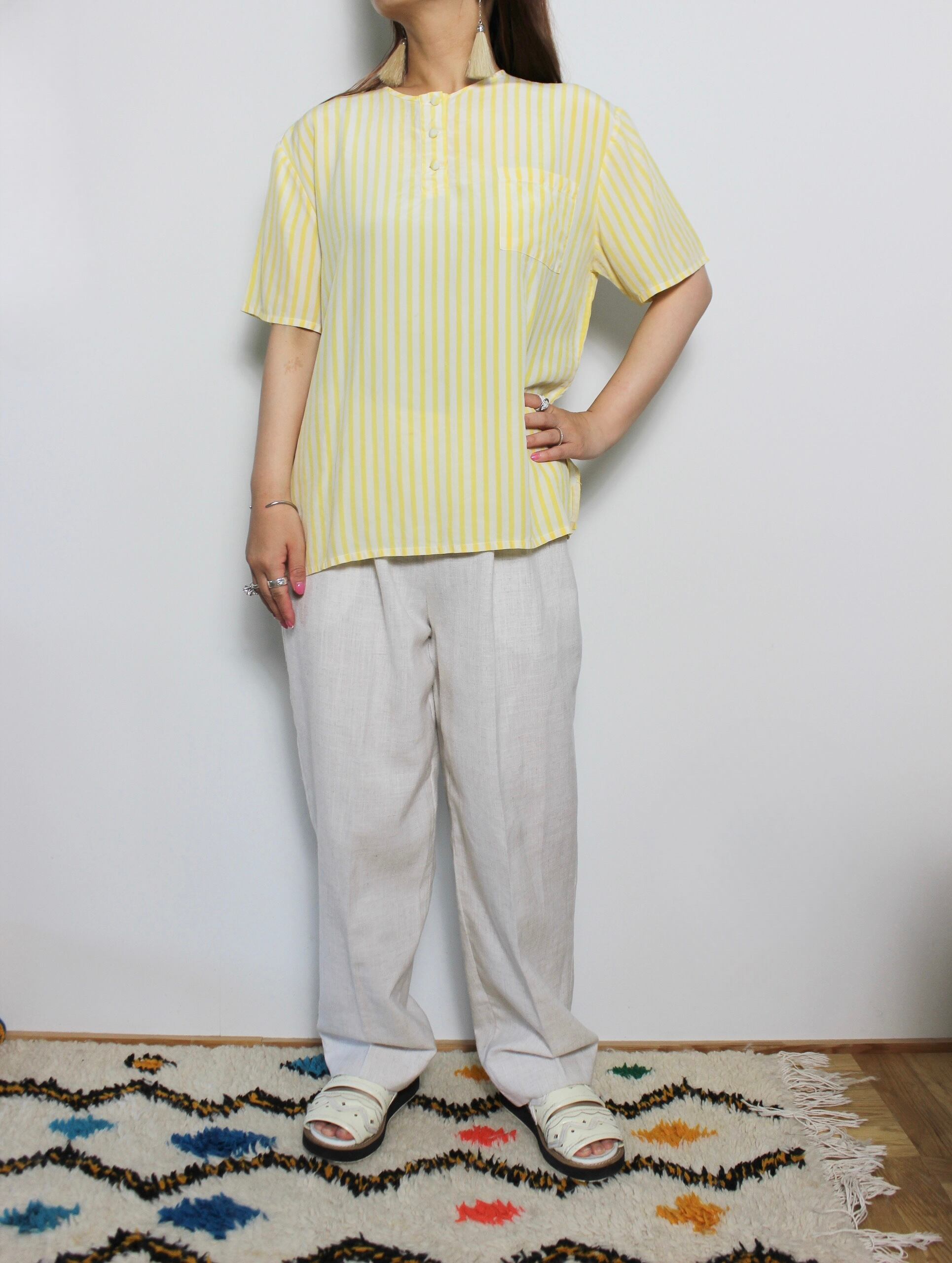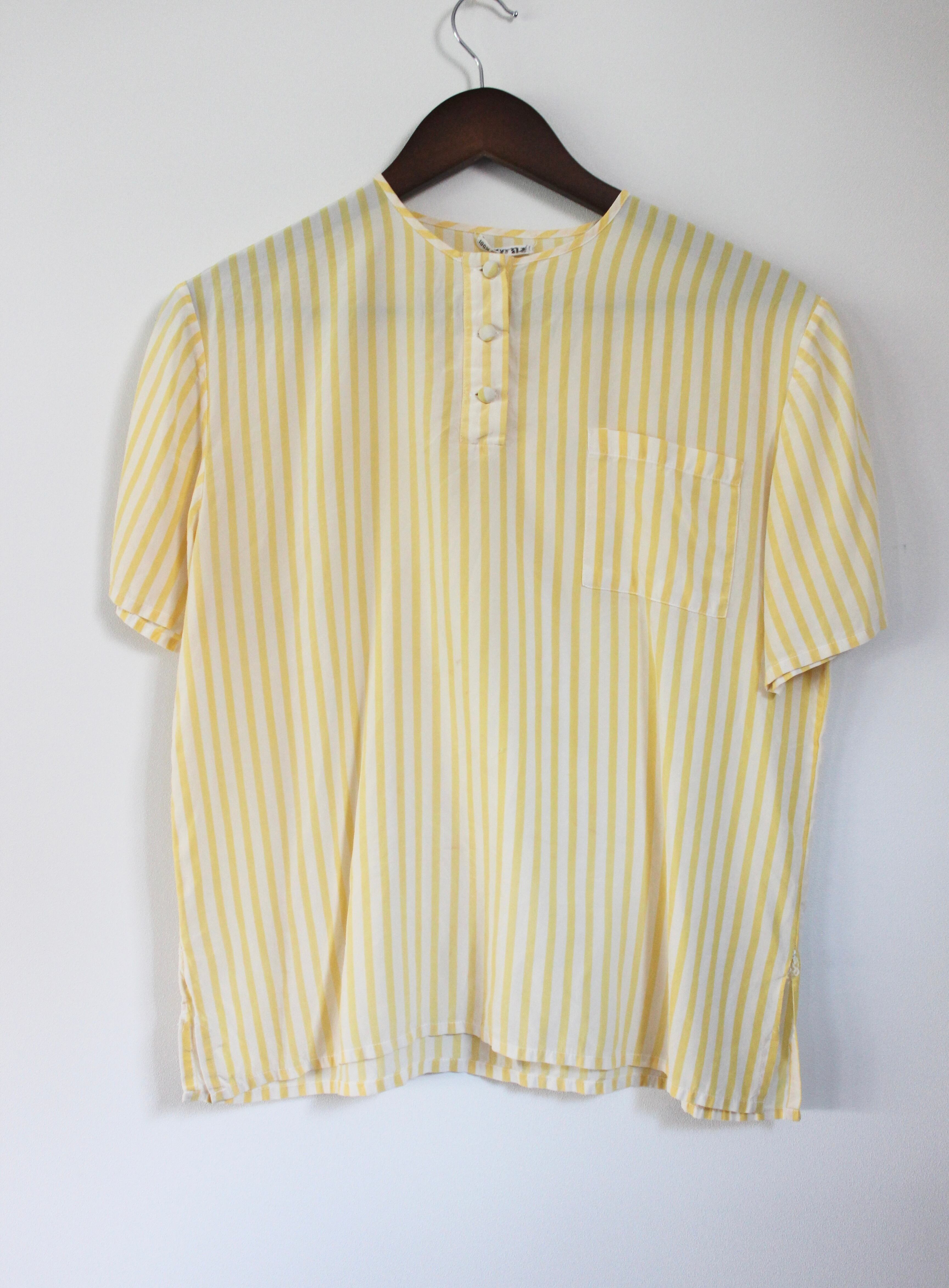 黄色と白のストライプが夏にぴったりな爽やかなトップスは、100%シルク生地で着心地もよい1着。