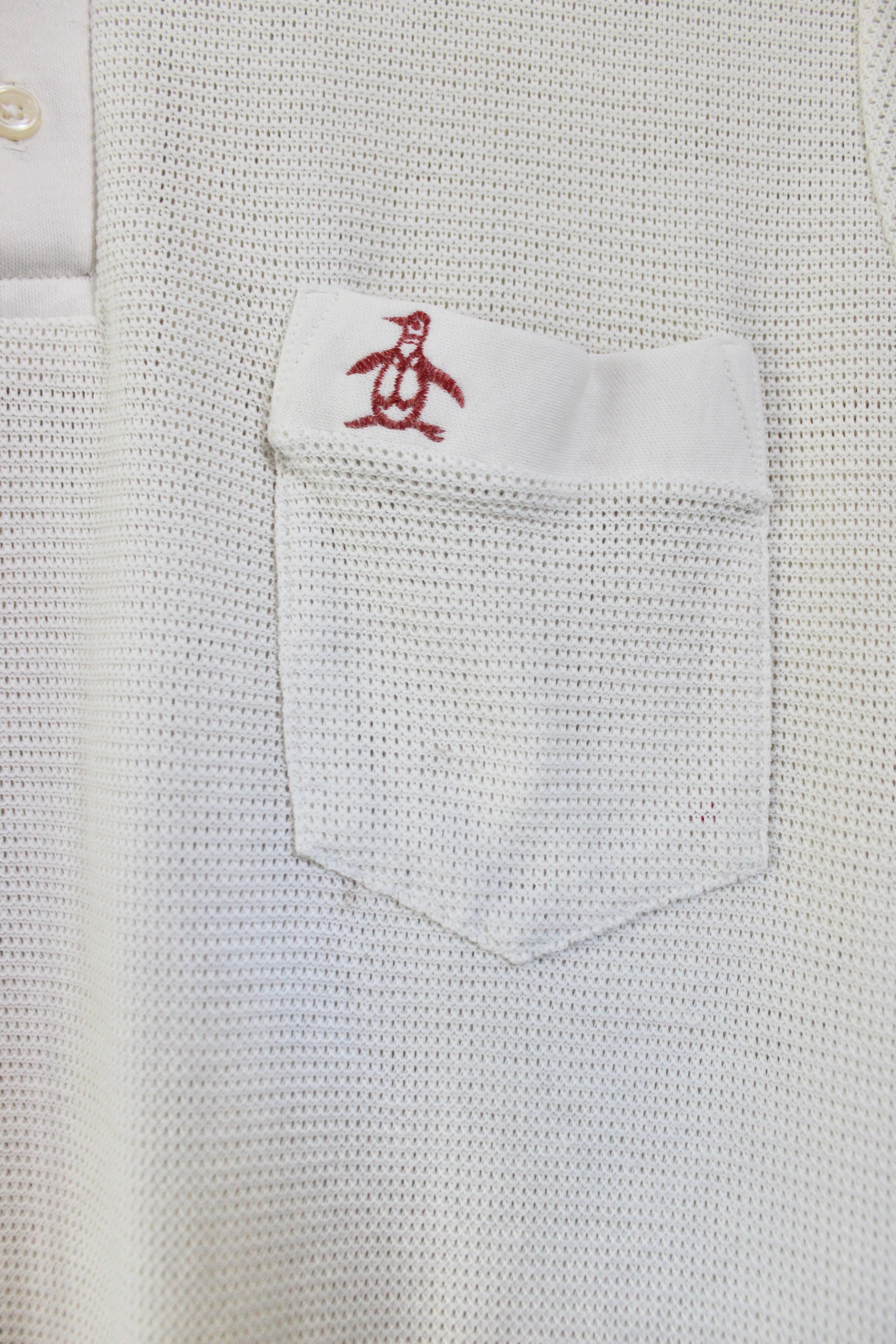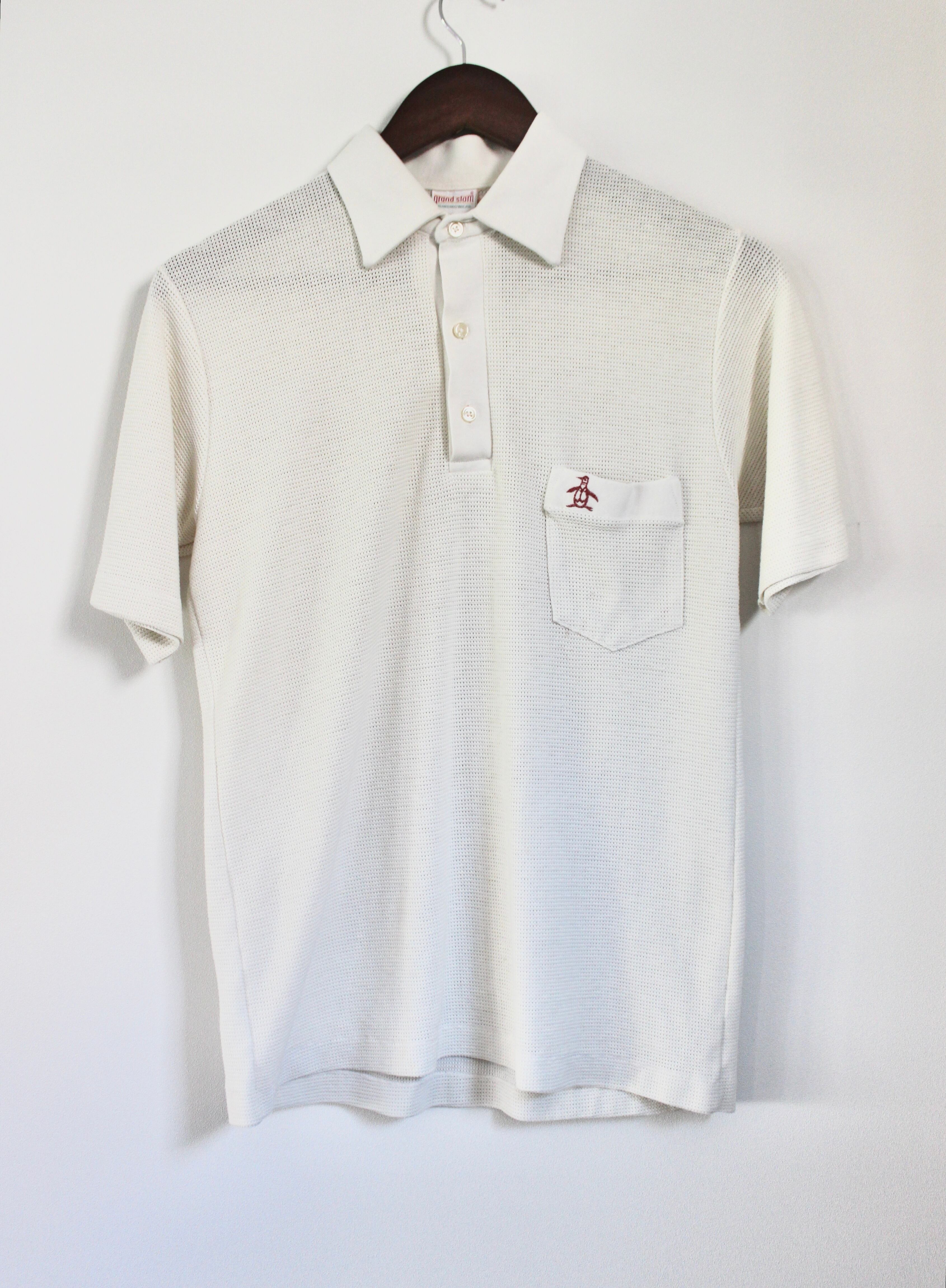 白の涼しげなメッシュ素材のポロシャツは、胸ポケットにペンギンの刺繍が施されているのがポイント。