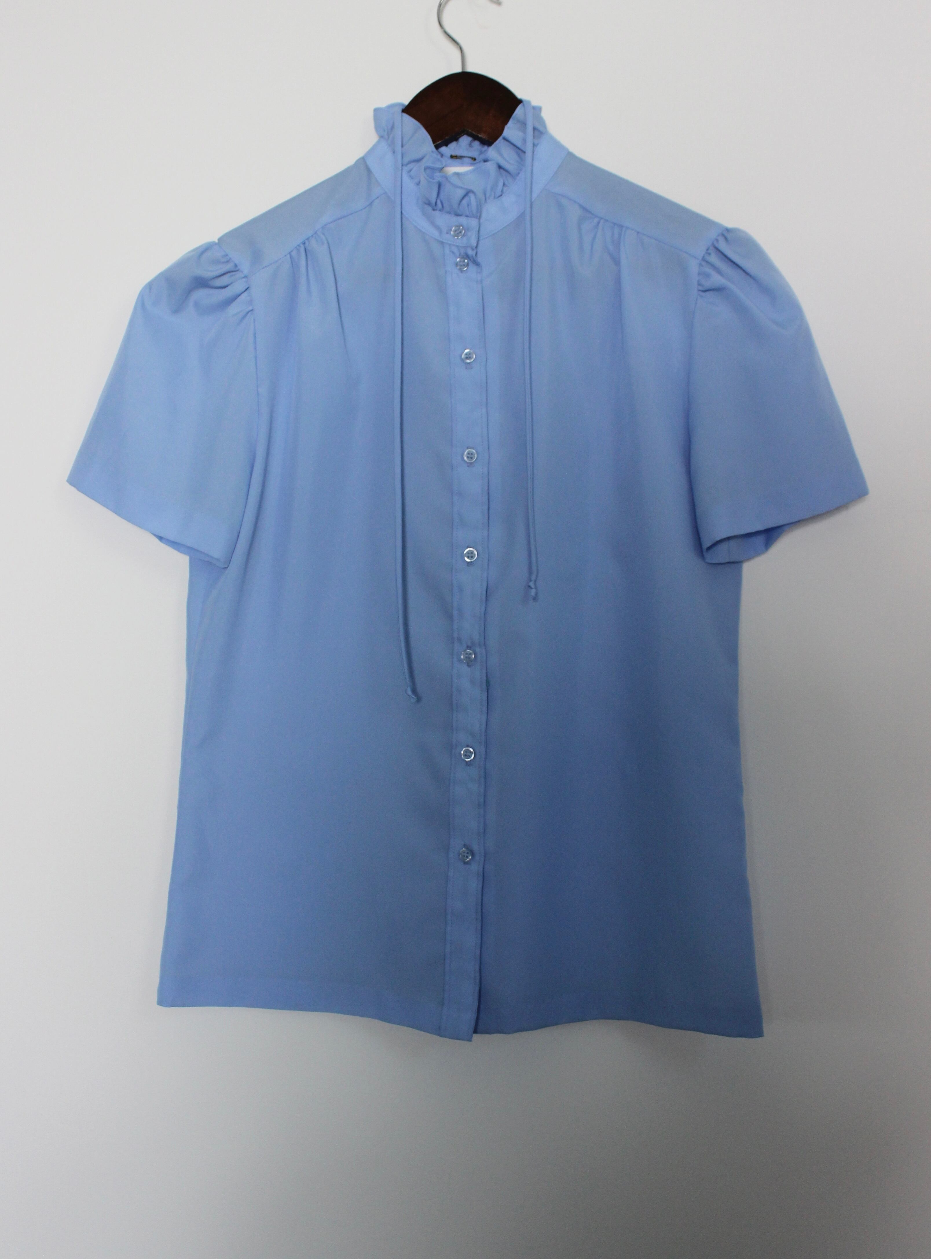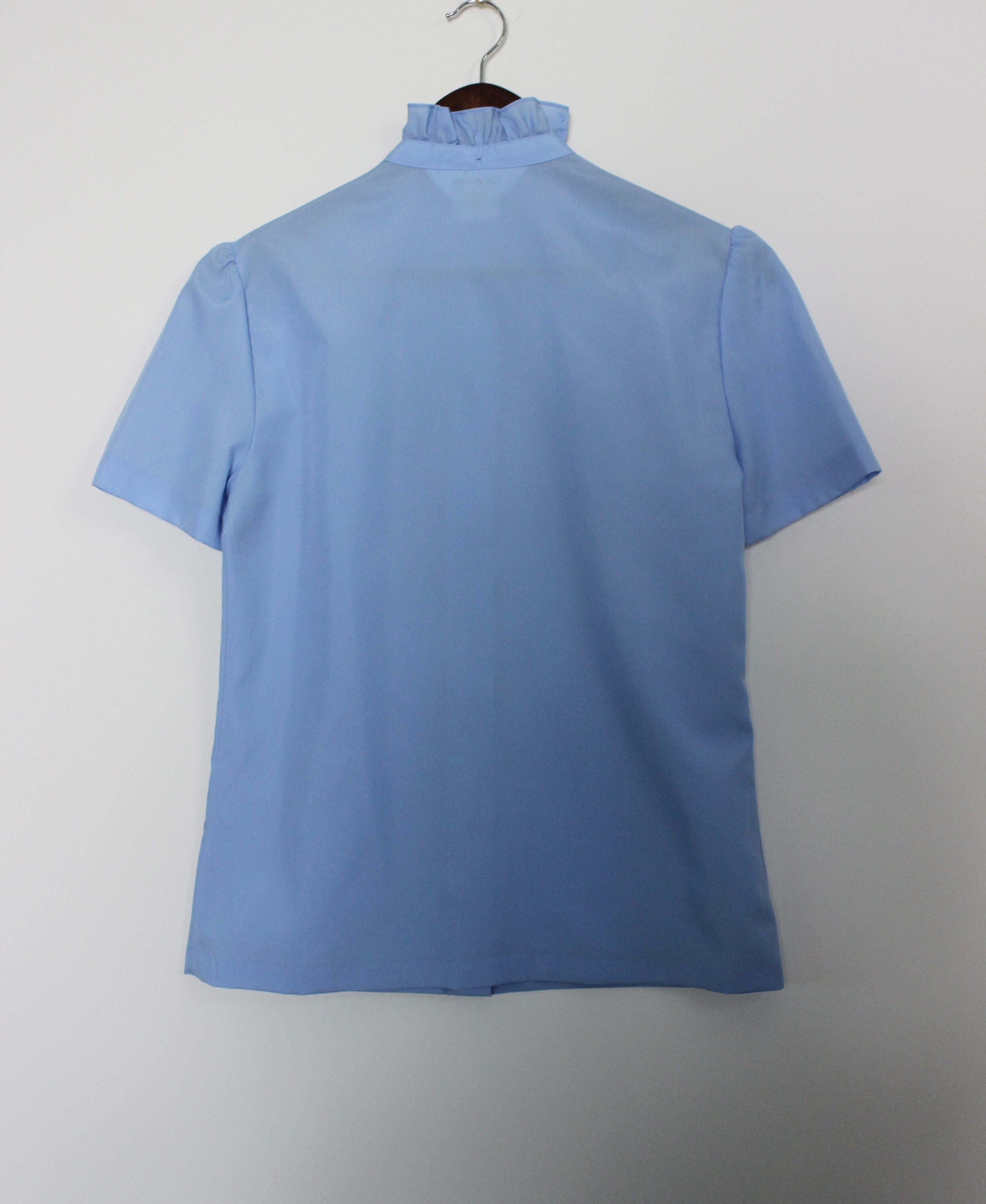 水色のハリのある生地の、大変形の綺麗なフリルトップスです。