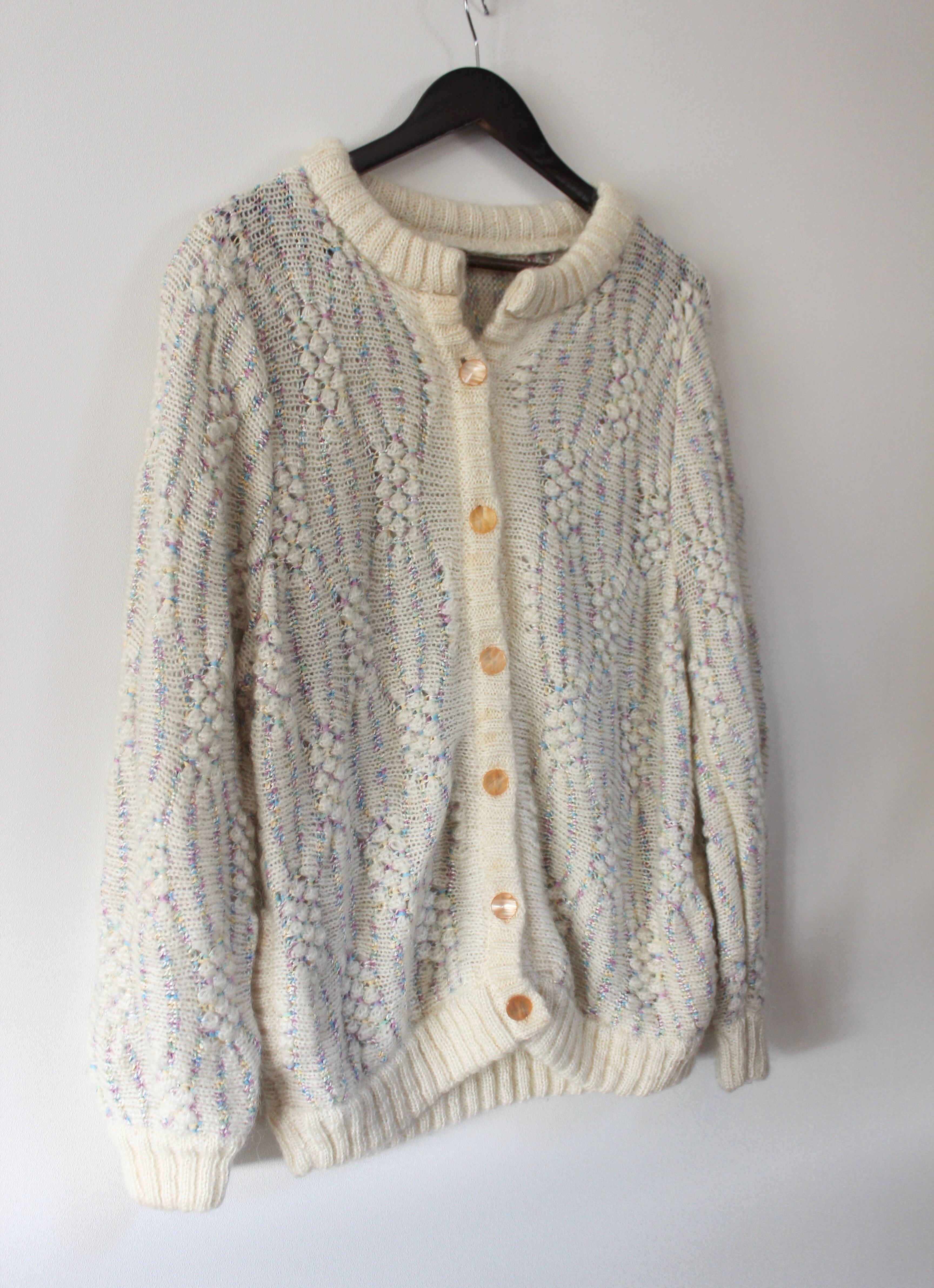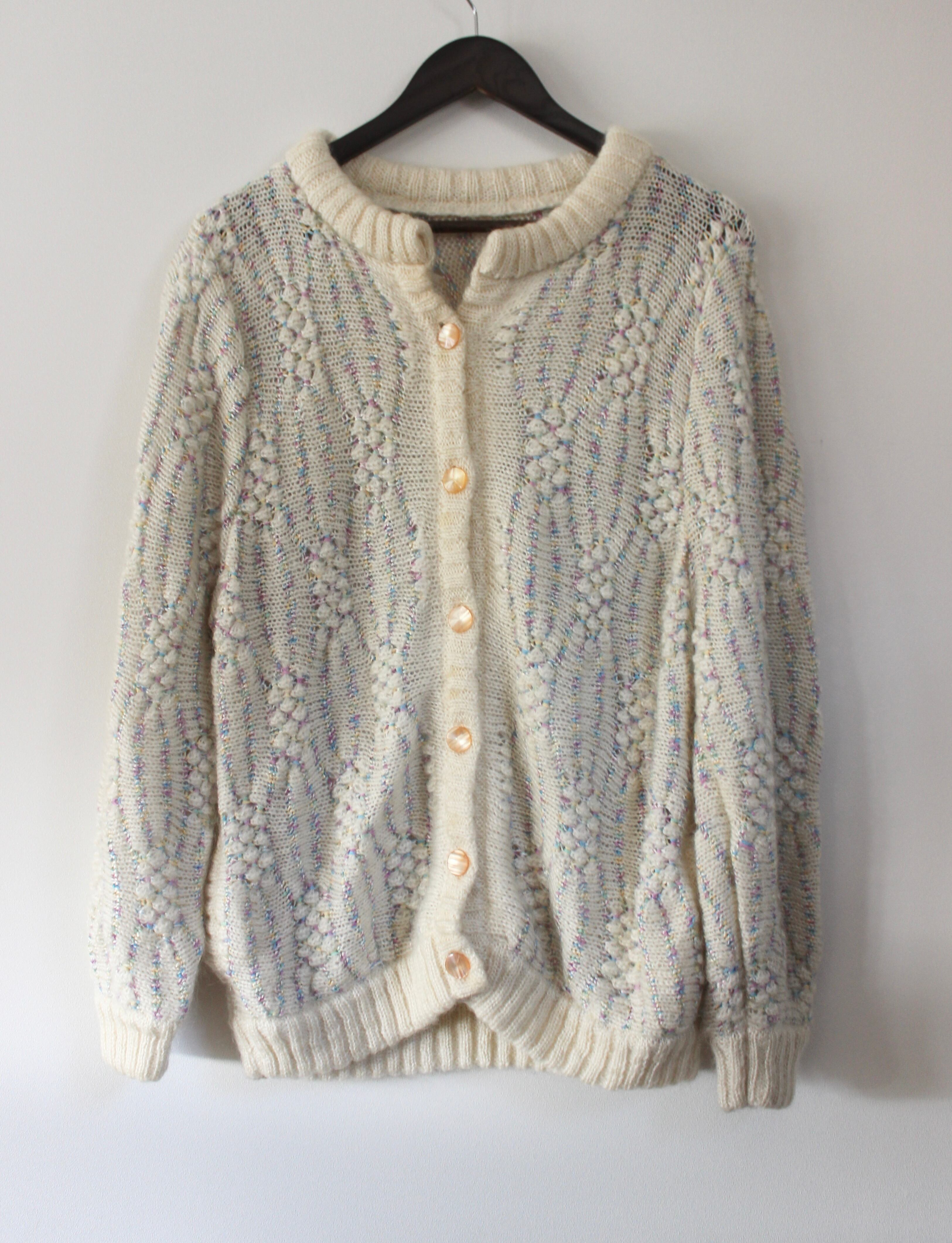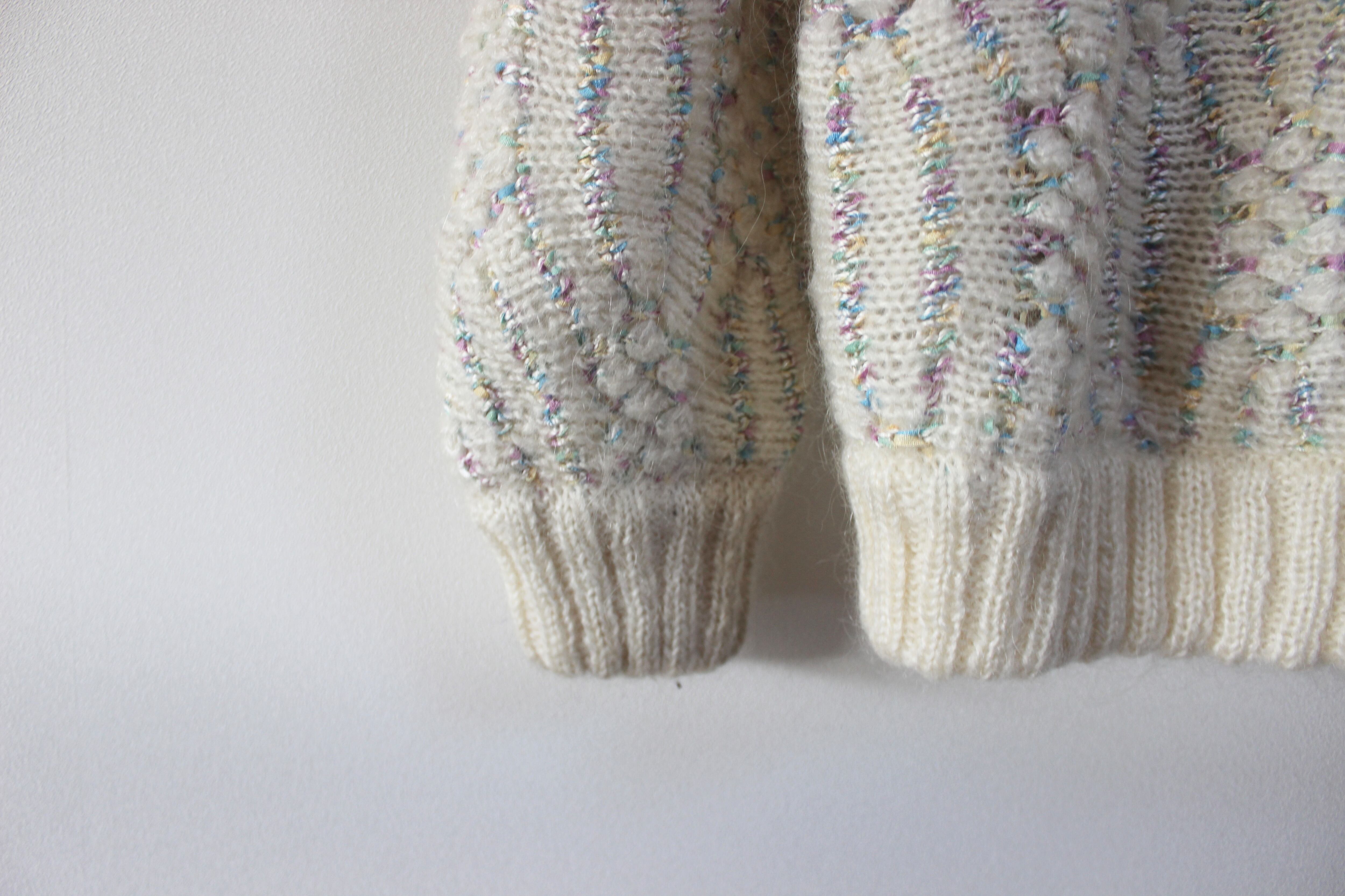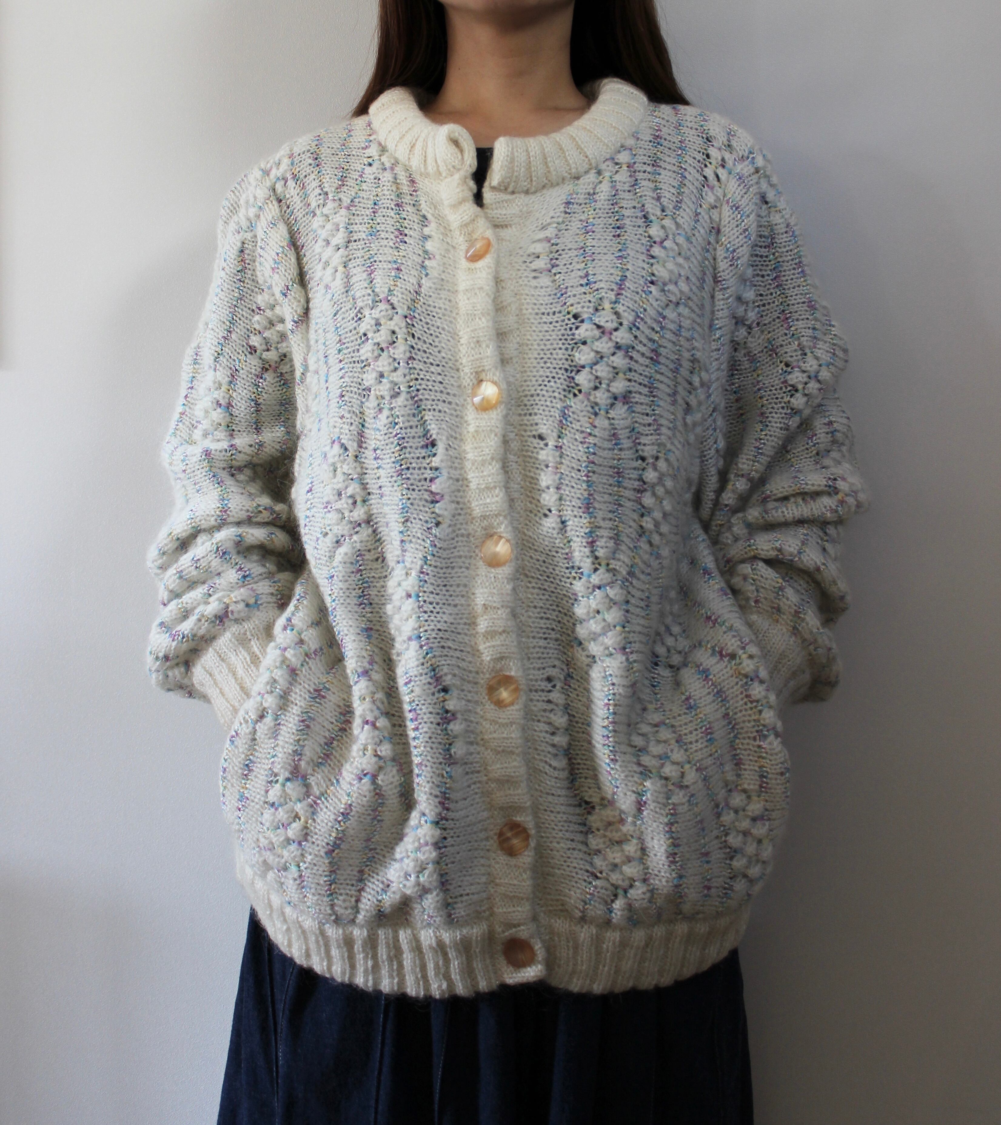 アイボリーにピンクや黄色、水色など淡い色合いの糸が編み込まれたニットカーディガン。