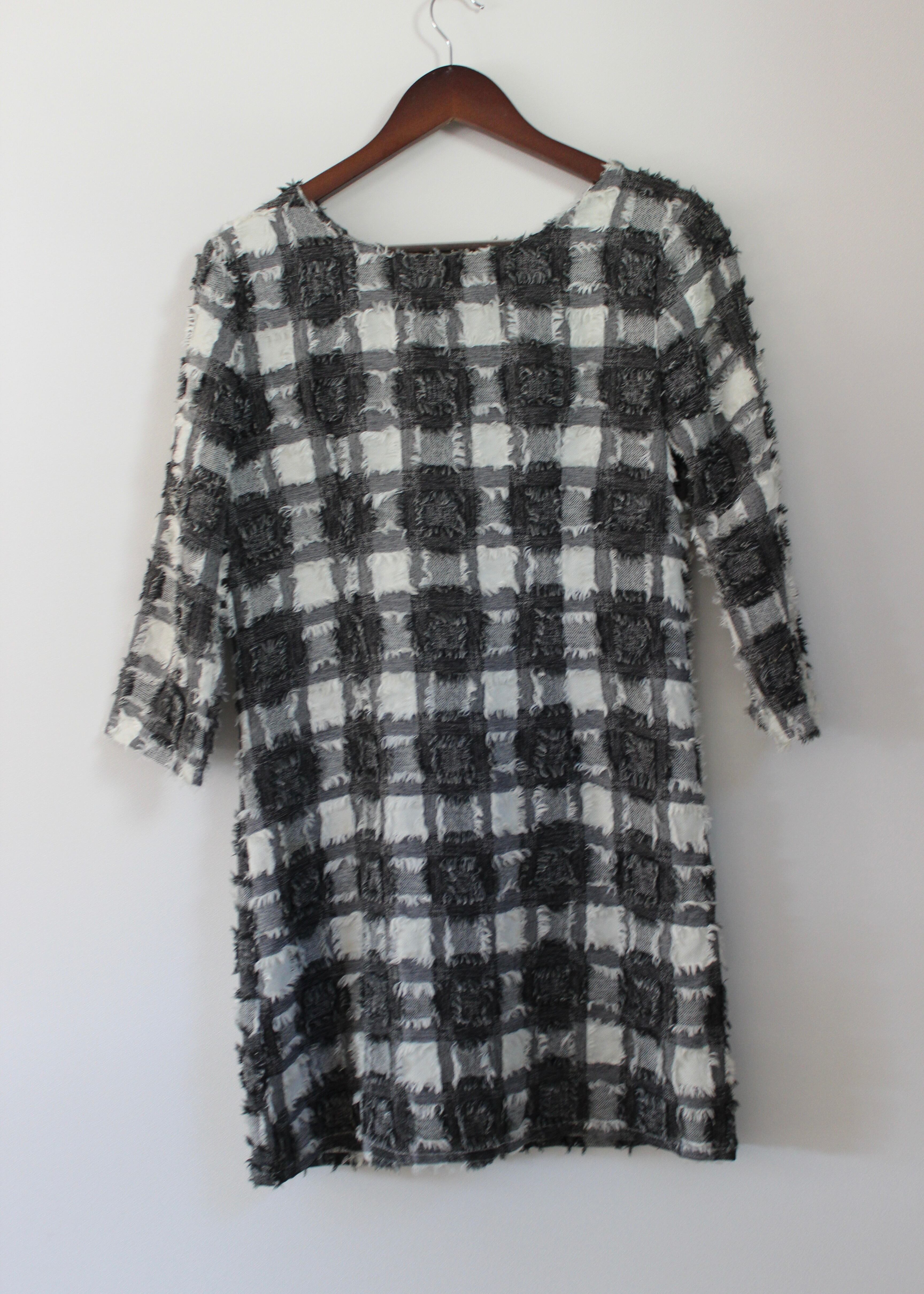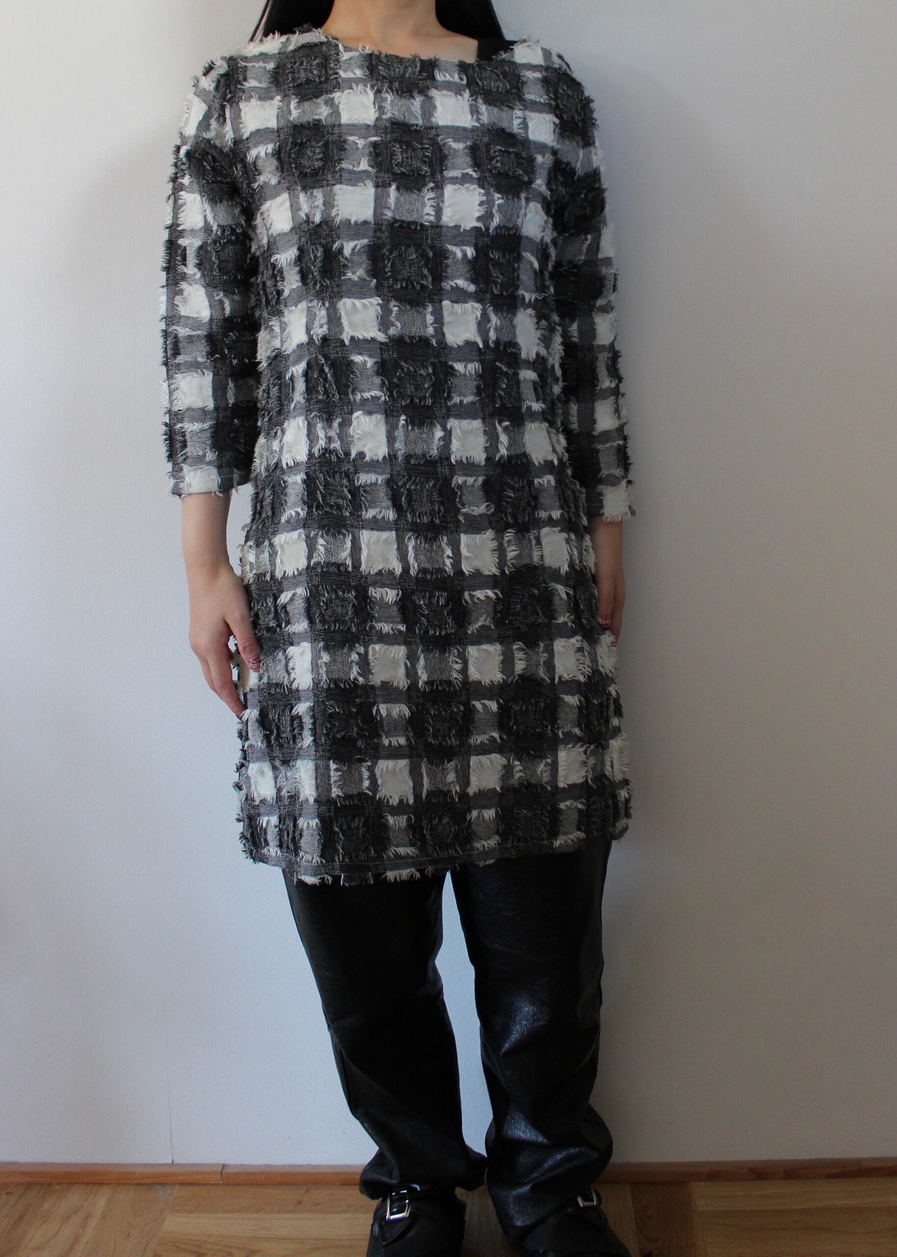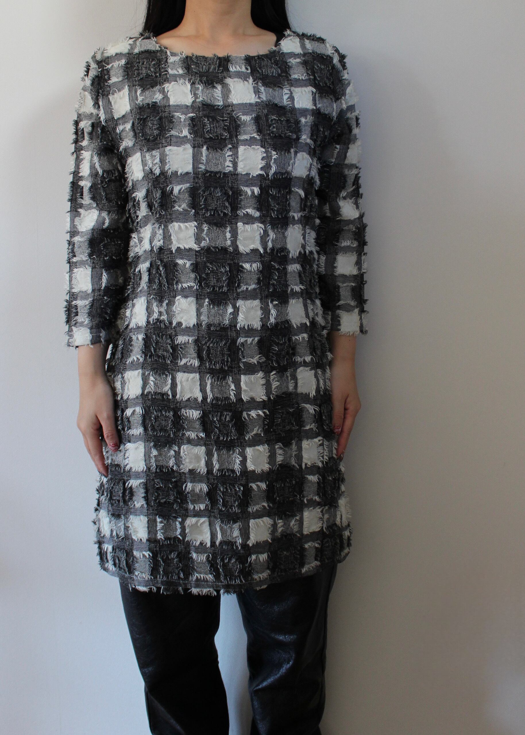 白とグレーのチェック柄に細かいフリンジが施された生地が特徴的なワンピース。